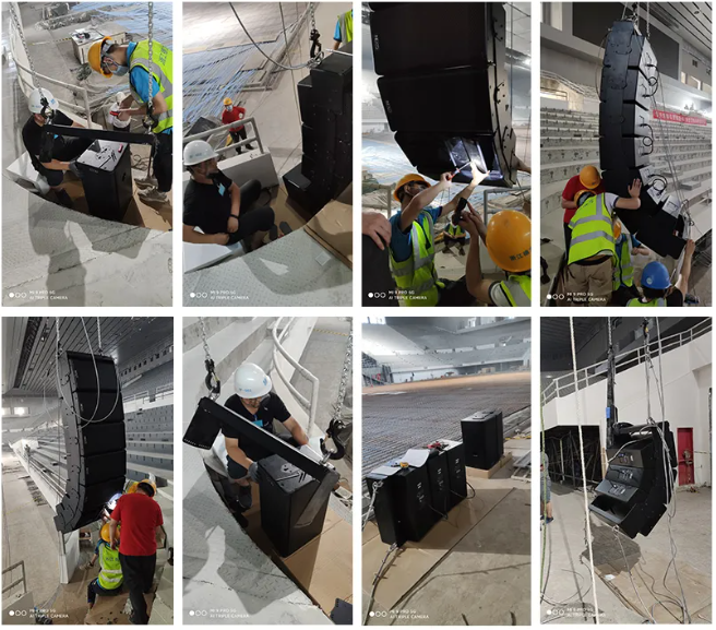 天博國(guó)際有限公司現(xiàn)場(chǎng)總負(fù)責(zé)人林社麟先生說道:“我們現(xiàn)場(chǎng)進(jìn)行安裝工作的時(shí)間十分有限,因此我們?cè)诘孛嫔习丫€陣列音箱組裝起來,并按照模擬軟件NS-1計(jì)算出來的角度和方向,調(diào)整好每個(gè)音箱,再把音箱吊掛到離地面十多米的位置固定好。再通過Dante網(wǎng)絡(luò)在電腦上使用NeMo軟件遠(yuǎn)程操控。將音量,增益,延時(shí),分頻點(diǎn)及輸出跳線設(shè)置好,并對(duì)音箱進(jìn)行檢查。最后這個(gè)體育館具有聲壓均衡且高清晰度的效果。”