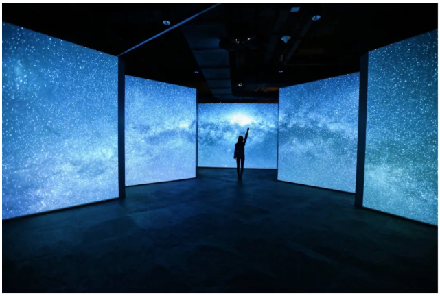 其中“五聯(lián)屏時空穿越廳”,展現(xiàn)穿梭時空的震撼,引出時間的產(chǎn)生與意義。通過上下三臺CB-L1060投影鐘表的鏈條,展示飛亞達表的文化和歷史。利用佳能投影機獨有的自帶0.54:1的鏡頭,通過有限的空間,展示出大畫面和細膩的圖像,還原飛亞達的鐘表歷史,詮釋出歷史與未來的演變。