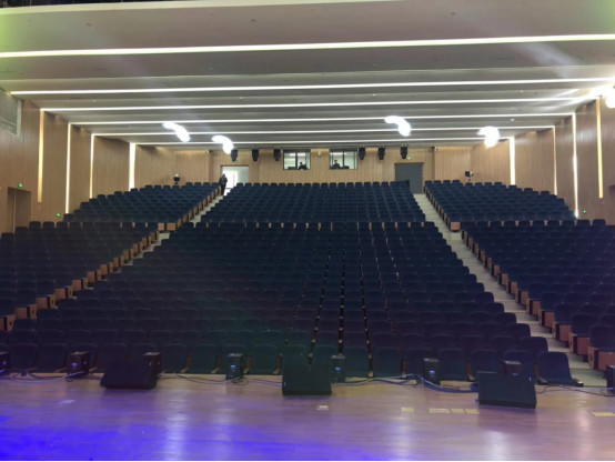 演藝廳舞臺左右兩側吊掛了各6只EV8寸線陣列覆蓋觀眾席,M15全頻音箱做下拉聲像揚聲器,B30超低音在舞臺下的預留孔洞中,臺唇位置設置了4只緊湊型的C5同軸揚聲器覆蓋前三排觀眾,4M12多功能揚聲器作為舞臺流動返送,全部的音箱都由系統功率放大器PLM12K44驅動,PLM12K44是一款4通道可遠程監控的DSP功率放大器,內置EV的揚聲器預設,便于使用者對揚聲器進行操控管理。演藝廳的擴聲系統還使用了16個通道的AKG DMS800數字無線系統。