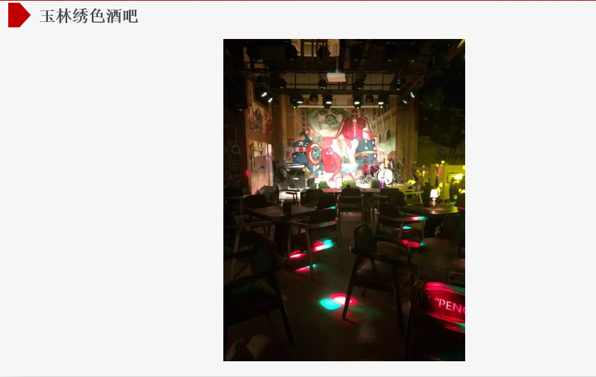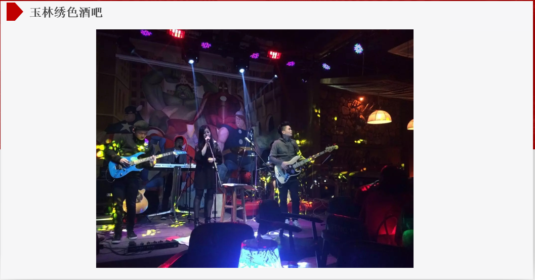 繡色酒吧是玉林市為數(shù)不多的現(xiàn)場樂隊(duì)類型的酒吧,開張之后,生意火爆,并經(jīng)常邀請國內(nèi)外的實(shí)力派歌手駐場,演奏。