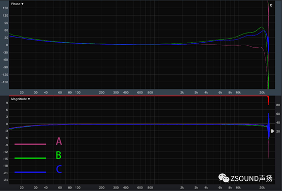 由圖可見三款產(chǎn)品的頻率響應(yīng)都能達(dá)到要求,幅頻響應(yīng)在±0.5dB之內(nèi),相頻響應(yīng)都在±30°之內(nèi),這其中還有一定的測(cè)量誤差。而三者之間的幅頻響應(yīng)差別還是顯而易見的,B型號(hào)的頻率響應(yīng)明顯比A和C差一些。