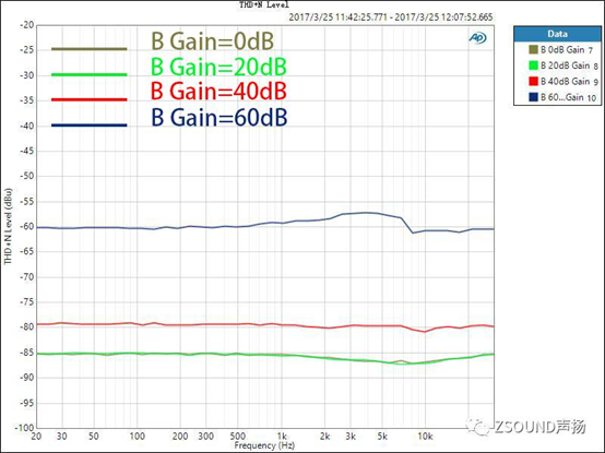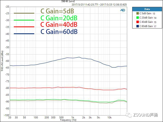 對(duì)于數(shù)字調(diào)音臺(tái),我們不僅要關(guān)心話放增益在0dB時(shí)的THD+N比率,還需要了解到,話放增益在不同位置時(shí)的情況,因?yàn)檫@是使用中的實(shí)際情形。話放的增益在不同大小時(shí),其引入的噪音和失真也是不同的,了解這一點(diǎn)對(duì)于用戶正確設(shè)置增益也很有參考意義。