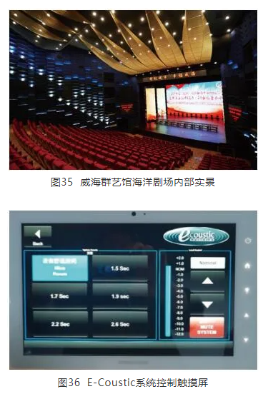 如前所述,E-Coustic系統(tǒng)基于世界最著名的專(zhuān)業(yè)混響器研發(fā)生產(chǎn)企業(yè)Lexicon而來(lái),其獨(dú)到的混響算法為這種嵌入式系統(tǒng)提供了一個(gè)非常好的再生聽(tīng)感,同時(shí)E-Coustic先進(jìn)的時(shí)變技術(shù),也很好地保證了系統(tǒng)的穩(wěn)定性。本系統(tǒng)中,傳聲器與揚(yáng)聲器的距離很近,但很好地抑制了聲反饋和聲染色的問(wèn)題。同時(shí)系統(tǒng)使用較少的傳聲器-揚(yáng)聲器通路,即能達(dá)到改變聲學(xué)環(huán)境的效果,也很大程度的降低了施工難度,這也是嵌入式系統(tǒng)的固有優(yōu)勢(shì)之一。威海市群藝館海洋劇場(chǎng)內(nèi)部實(shí)景及E-Coustic控制觸摸屏分別如圖35和圖36所示。