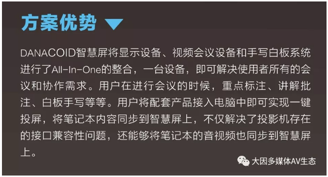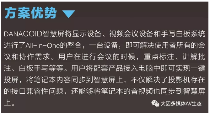 企業(yè)會(huì)議是信息交互的平臺(tái),實(shí)現(xiàn)信息的傳遞主要是兩種方式就是視和聽(tīng)。視覺(jué)的內(nèi)容主要是圖像和文字資料,聽(tīng)覺(jué)的內(nèi)容則是聲音。DANACOID通過(guò)DyneShare、DynePro系列打造音視頻全IP化,讓您體驗(yàn)優(yōu)質(zhì)的聲音、便捷行程安排、簡(jiǎn)單的系統(tǒng)操作和靈活系統(tǒng)擴(kuò)展。