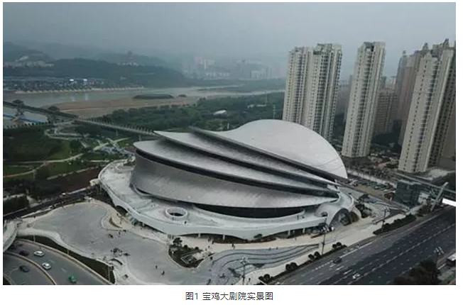為迎接第九屆陜西省藝術節,讓廣大人民群眾共享文化惠民成果,同時提升寶雞市文化軟實力和綜合競爭力,故興建寶雞大劇院。寶雞大劇院項目選址位于寶雞市金臺區新東嶺城市綜合體范圍內(圖1),于2020年10月投入使用。