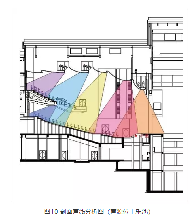 觀眾廳剖面設計取決于兩個因素。一是規范規定的每座容積,它能確定觀眾廳吊頂的大概高度;二是觀眾廳剖面聲線分析,它能確定吊頂的最終形式。結合上述兩個因素,最終確定的吊頂形式如圖9、圖10所示。可以看出,經吊頂反射的聲音能覆蓋觀眾席的所有區域,其分布均勻,能達到良好的聲場效果。