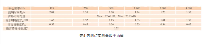 根據混響時間測量規范,在觀眾廳內共布置17個測點,對主劇場進行空場竣工檢測,各參數檢測結果見表4。