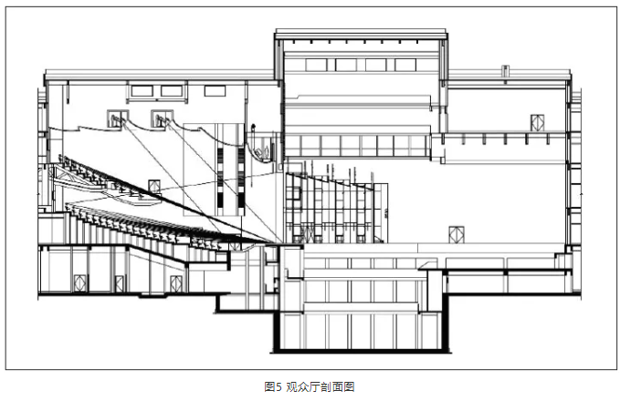 樓座欄板應避免垂直面,做吸聲或擴散處理。根據觀眾廳混響時間控制,以及結合內裝裝飾效果,在欄板部分做弧形擴散處理,大樣示意見圖12。
