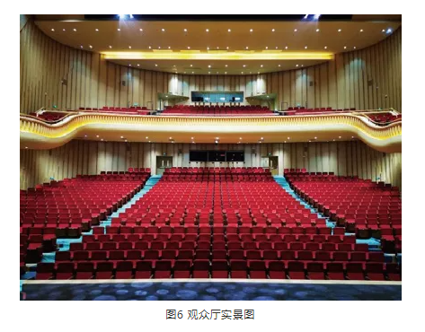 寶雞大劇院主劇場主要以演出國內外各類音樂劇、交響樂、地方戲曲等舞臺類演出,以及舉辦大型會議為主。主劇場座位數約1 205座,其中池座870座,臨時座椅90座,二層樓座225座,包廂20座;有效容積約10 309 m³,每座容積8.5 m³/座。主劇場建筑平面略呈馬蹄形,樓座由觀眾廳后部延伸至兩側,良好的體型為建筑聲學提供了較好的聲場環境。舞臺呈品字形,包含主舞臺、側舞臺和后舞臺,舞臺總面積1 768 m2,舞臺開口為16 m×10 m;舞臺臺口線至池座和樓座后墻最大水平距離為32 m;觀眾廳最大寬度為29.2 m;樓座下開口高深比5.2:7.3=1:1.4≥1:1.5,符合規范要求。池座觀眾席共22排(圖3),前后高差(總起坡)為5.5 m, 平均起坡為0.26 m;樓座觀眾共7排(圖4),前后高差(總起坡)為2.98 m,平均起坡為0.5 m。舞臺設有活動音樂罩,觀眾席前部設升降樂池。劇場主揚聲器設于臺口前部天花主揚聲器橋內,拉聲像揚聲器位于臺口八字墻區域,所有揚聲器均為暗藏式;音控室、燈控室設于池座后墻的中部。圖5~圖6為觀眾廳剖面圖及實景圖。