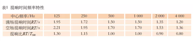 • 混響時間RT:要求滿場1.5 s±0.1 s,空場1.7 s±0.1 s,頻率特性見表1。