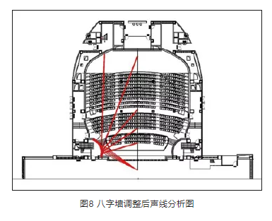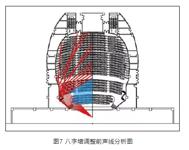 主劇場觀眾廳平面整體呈馬蹄形,能提供良好的聲場效果。主劇場同時承擔音樂演出的需求,需要以自然聲進行演出,舞臺八字墻設計尤為重要。舞臺八字墻能為觀眾席前區提供前次反射聲,提高該區域觀眾的觀演效果。圖7為調整前的臺口八字墻聲線分析圖,可以看出,圖中藍色區域,即觀眾廳前中區缺少前次反射聲。對八字墻形狀進行調整后的聲線分析見圖8,前次反射聲能覆蓋觀眾席中前區,保證觀眾席區域觀眾能夠獲得很好的豐滿感。