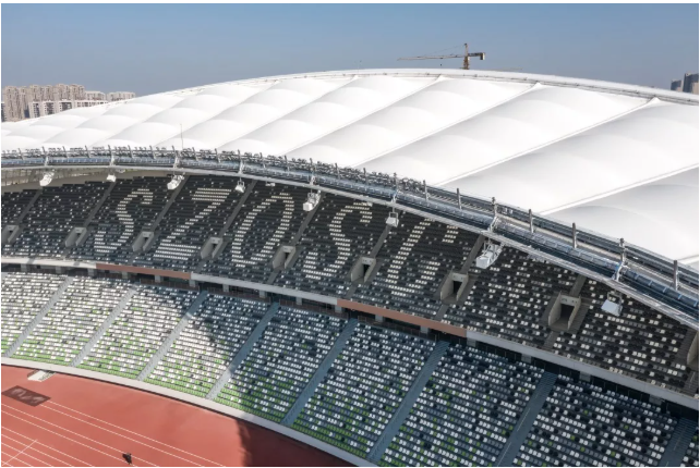 蘇州奧林匹克體育中心體育場是迄今為止中國第一座馬鞍形單層索膜結(jié)構(gòu)屋頂設(shè)計(jì)的體育場,通常則為鋼架結(jié)構(gòu),這一次的特殊結(jié)構(gòu)意味著只能借助全場40個(gè)索頭拉住膜。