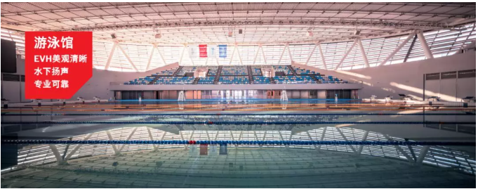 游泳館除了設(shè)有標(biāo)準(zhǔn)競賽游泳池、訓(xùn)練池外,還設(shè)有各種水療休閑設(shè)施、部分水上用品商業(yè)以及兒童娛樂池和滑道等,供普通市民休閑娛樂使用。在游泳館頂部,業(yè)主同樣選用了白色EVH系列揚(yáng)聲器,在美觀度和品質(zhì)方面和場館高度統(tǒng)一。