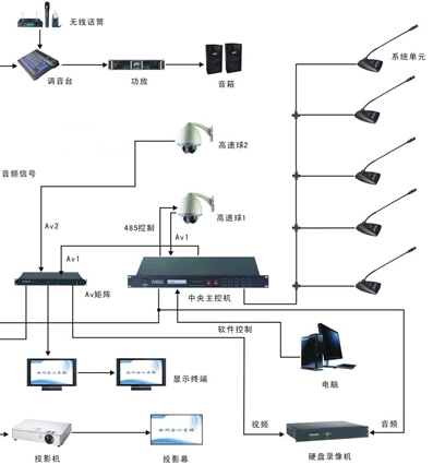 中央控制系統集中了燈光、機械、投影及視音頻控制手段于一體,為使用者提供簡單、直接的控制方案,令使用者能方便地掌握整個空間環境音響設備的狀態及功能。本系統可對會議室內各種音視頻設備及燈光、電動窗簾、電動投影幕、電動升降吊架等設備采用集中控制方式,以方便操作和使用。包括數字會議發言、討論設備開啟、關閉;攝像球的轉動、鏡頭控制;會議廳音響系統的開啟、關閉、音量調節;會議廳投影機、液晶顯示器的開啟、關閉;視頻矩陣的切換、選擇;會議廳照明燈光的明暗調整;液晶顯示器升降控制等。