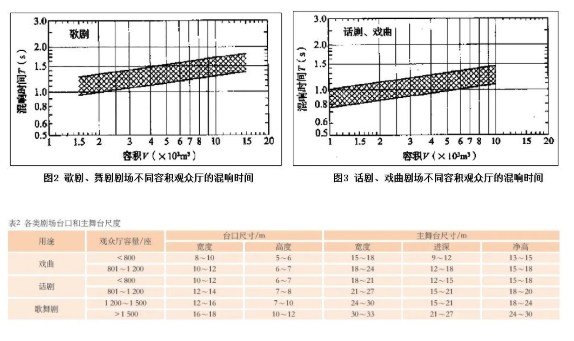 不同功能劇場(chǎng)的混響時(shí)間,GB/T50356—2005《劇場(chǎng)、電影院和多功能廳堂建筑聲學(xué)設(shè)計(jì)規(guī)范》(以下簡(jiǎn)稱(chēng)GB/T 50356—2005)中均有規(guī)定,詳見(jiàn)圖2、圖3,以戲曲功能為主的劇場(chǎng),在相同容積下,其觀眾廳混響時(shí)間較其它功能劇場(chǎng)低。同時(shí),舞臺(tái)建設(shè)依據(jù)JGJ 57—2016《劇場(chǎng)建筑設(shè)計(jì)規(guī)范》,臺(tái)口和主舞臺(tái)尺度如表2,舞臺(tái)的空間通常比較大。因此,大空間的舞臺(tái)與規(guī)模不大的觀眾廳的聲耦合,也是聲學(xué)設(shè)計(jì)中需要考慮的問(wèn)題。
