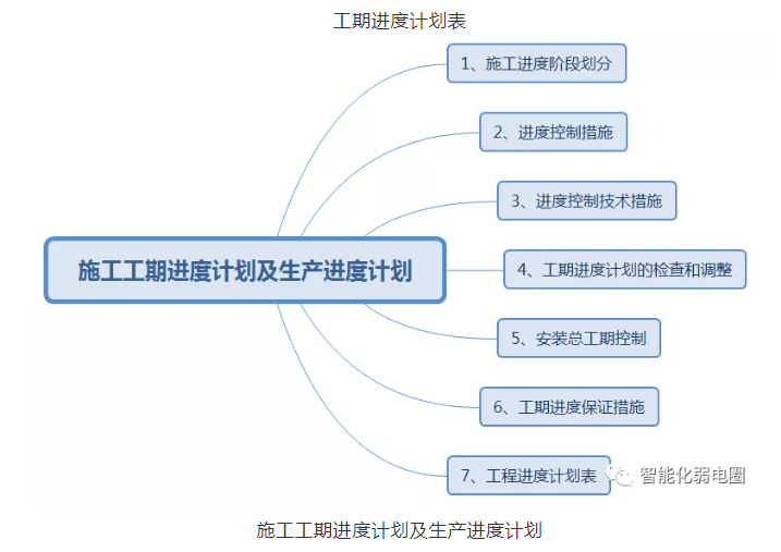 該部分內容一般主要介紹施工進度階段劃分、進度控制措施、進度控制技術措施、工期與進度計劃的檢查和調整、安裝總工期控制、工程進度保證措施,工期進度計劃表等。