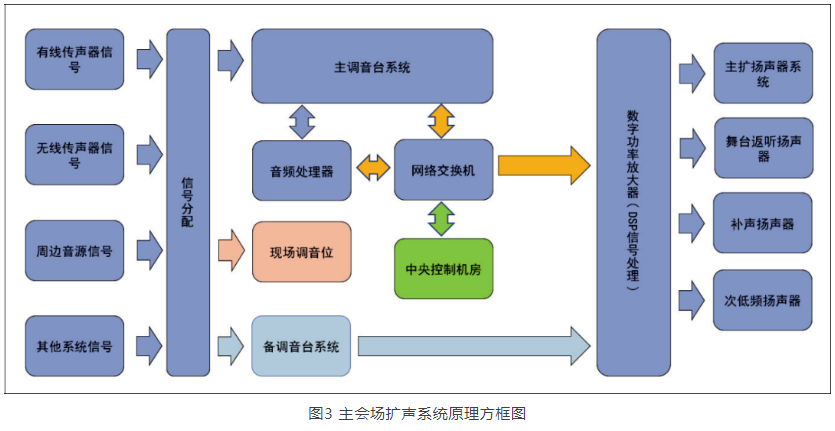 擴(kuò)聲系統(tǒng)架構(gòu)如圖3所示。本地傳聲器輸入信號(hào)可通過無源傳聲器分配器,分別送至數(shù)字調(diào)音臺(tái)、模擬調(diào)音臺(tái)以及現(xiàn)場調(diào)音位。數(shù)字調(diào)音臺(tái)信號(hào)既可通過網(wǎng)絡(luò)音頻方式(DANTE協(xié)議),也可通過獨(dú)立數(shù)字音頻處理器組送至數(shù)字功率放大器;模擬調(diào)音臺(tái)信號(hào)直接接入數(shù)字功率放大器,通過功率放大器內(nèi)置DSP對(duì)輸入信號(hào)進(jìn)行主備信號(hào)倒換。