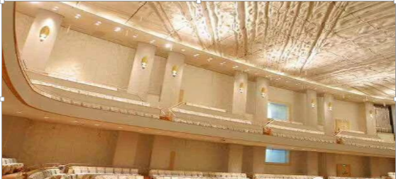 音樂(lè)廳的天花板形狀不規(guī)則的白色浮雕像一片起伏的沙丘。天花板上看似凌亂的溝槽實(shí)際上經(jīng)過(guò)了特別的聲學(xué)設(shè)計(jì),使聲音能夠被擴(kuò)散反射,更加均勻、柔和。精美的天花板其實(shí)是特制的聲擴(kuò)散裝飾板。天花板使用纖維石膏成型板制成,材質(zhì)厚重,能夠有效地防止低頻吸收,增強(qiáng)廳內(nèi)的低頻混響時(shí)間,使低音效果(如管風(fēng)琴、大管、大提琴等)更加具有震撼力和感染力。為達(dá)到聲效的完美,在頂棚的下面還懸掛了一面龜背形狀的集中式反聲板,俗稱(chēng)“龜背反聲板”,它的作用是將聲音向四面八方散射。