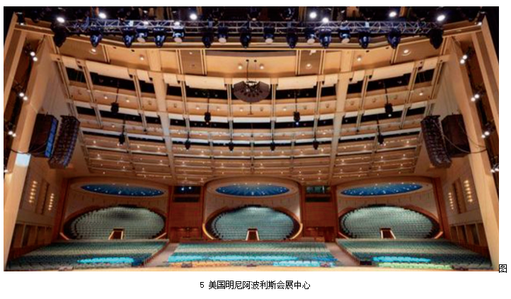 此外,還有一些劇場由于應(yīng)用場景的不同,揚聲器系統(tǒng)既要減少舞臺垂直方向上對觀眾的視覺影響,還要滿足較寬觀眾席對水平覆蓋的需求。例如美國明尼阿波利斯會展中心使用ARCS恒定曲率線陣列揚聲器,這種揚聲器陣列在垂直方向上的輻射角度不可調(diào)整,但水平角度上中置揚聲器幾乎可以覆蓋到整個觀眾席,甚至可以比左右聲道揚聲器承擔(dān)更大的功率,這對于以語言類為主的會議等應(yīng)用場景來說是十分方便且有效的。
