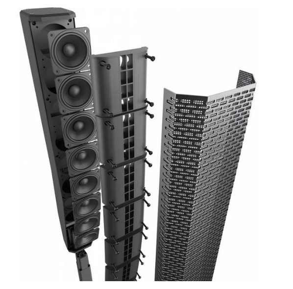 陣列的外箱由耐用的復合材料制成,并配有符合人體工程學的鋁制把手。超低音采用15mm木制外箱,里面含有一個12寸低音單元,采用高效的層流通風口設計。陣列和超低通過對稱的鋁桿與內部布線和磁吸閂鎖連接。揚聲器裝有一個黑色粉末噴涂的18 gauge標號鋼制網罩作保護用途,還包含一個陣列/拉桿運輸箱。先進的D類放大器可提供高達1,000W的功率。