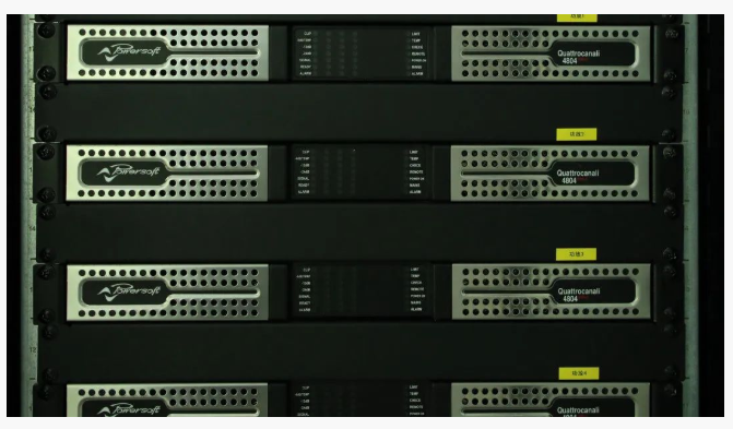 功率放大器全部采用Powersoft Quattrocanali 4804 DSP+DANTE數(shù)字功率放大器。擴(kuò)聲控制室與功放機(jī)房之間采用光纖網(wǎng)絡(luò)音頻的方式進(jìn)行遠(yuǎn)距離傳輸,縮減模擬線路傳輸距離,降低線路損耗,有效提升系統(tǒng)內(nèi)音頻信號的傳輸質(zhì)量。