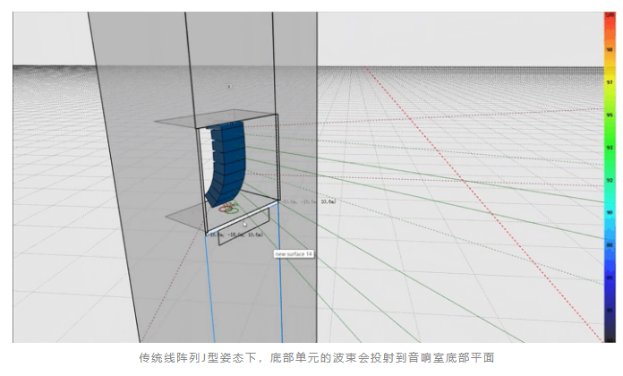 在暗裝的方式下音響室空間通常狹小緊湊。在本項(xiàng)目中,音響室的底部平面距離陣列僅10厘米。如果采用傳統(tǒng)線陣列的擴(kuò)聲系統(tǒng),陣列會(huì)形成J字型物理姿態(tài),不僅占用較大的安裝空間,J型底部的音箱單元還有可能將聲能投射到音響室的底部平面上,導(dǎo)致大部分高頻能量無(wú)法穿透出來(lái),從而無(wú)法覆蓋到一部分前區(qū)的觀眾區(qū)。選用Anna,它的垂直吊裝方式既能節(jié)約了安裝空間,還能將高中低頻單元統(tǒng)一的盡可能靠近透聲幕,躲避音響室底部平面對(duì)波束的遮擋,最終實(shí)現(xiàn)幾乎全場(chǎng)的覆蓋。
