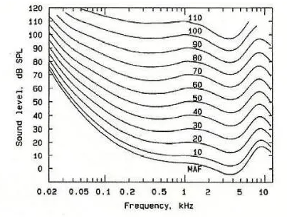 換句話說,如果我們想讓100 Hz的音調與3.5 kHz的音調聽起來一樣大,100 Hz時的聲音必須比3.5 kHz時的聲音大上15 dB!(這里我們假設3.5 kHz的音調為85 dB SPL)